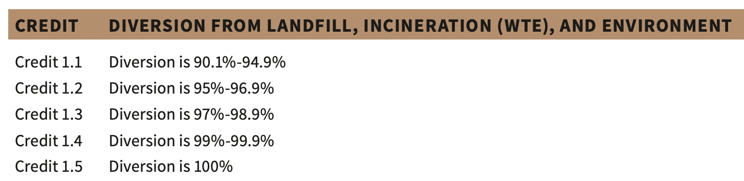 Zero Waste is a goal. Institutions that offer Zero Waste certification such as ZWIA, the US Green Building Council under its TRUE (Total Resource Use and Efficiency) program, and others, set a minimum 90.1% waste diversion requirement from landfills, incinerators and the environment for certification. This means that more than 90.1% of post-industrial and/or post-consumer waste is recovered for future use through recycling, composting, and other processes. While 90.1% diversion rate may seem daunting when compared to existing global recycling averages, most businesses, communities and households can reach zero waste easily and quickly, while others can do so with a little more effort. Below is a description of TRUE’s Credits for waste diversion performance.[34] Note that TRUE even has a credit for 100% diversion rate, which suggests that anything is possible!
