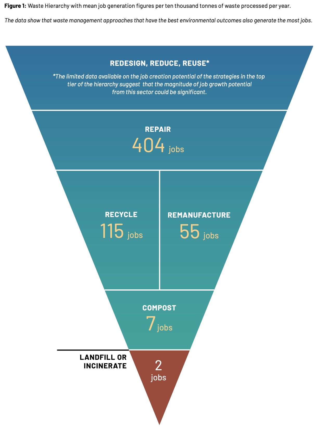 A highly-performing, Zero Waste Circular Economy is also a great job creator, evidenced by the Ecozinha Institute case described above and according to a report published by Gaia[39], which suggests that more than 200X jobs can be created in a Zero Waste economy for every one job created in a landfill or incineration plant. The diagram below shows the areas of the economy that benefit the most, comparing composting, recycling, remanufacturing, repair and redesign, reduce and reuse, to landfilling and incineration. The data in the report shows that waste management approaches that have the best environmental outcomes also generate the largest number of new jobs.