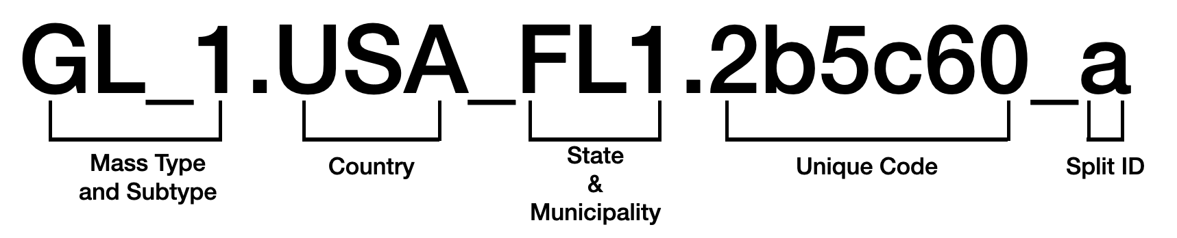 This code explains how a MassID is read. In this example, the MassID would represent a unit of glass of subtype color amber (#1) sourced in the state of Florida, USA; followed by a unique code. A split ID would identify a MassID that was split either to fill a shipment order carrying more IDs than are available in a Processor’s inventory or when it is packaged into a Tokenized Recycling Credit. (See MassID Splits section for more information.)