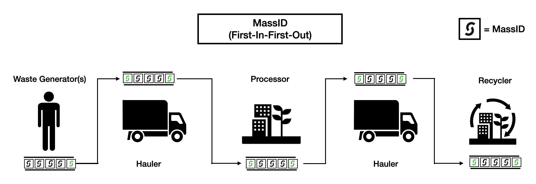 Unlike product supply chains where units, boxes, crates and shipping containers have barcodes or QR codes for tracking each consumer good, waste is typically fungible and sorted based on mass type. MassIDs represent ownership and responsibility over a unit of waste mass, therefore, the existence of a waste mass must be agreed upon by two parties and the chain of custody must track MassID responsibility among participants until it is recycled. Proof-of-Physical work recorded through georeferenced logistics service orders allow for changes in record and custody of MassIDs, improving the data point each time a validator performs a logistics workflow. MassIDs are stored in each participant’s inventory (wallet address) and transferred on a First-In-First-Out (FIFO) basis upon completion of each logistics operation: