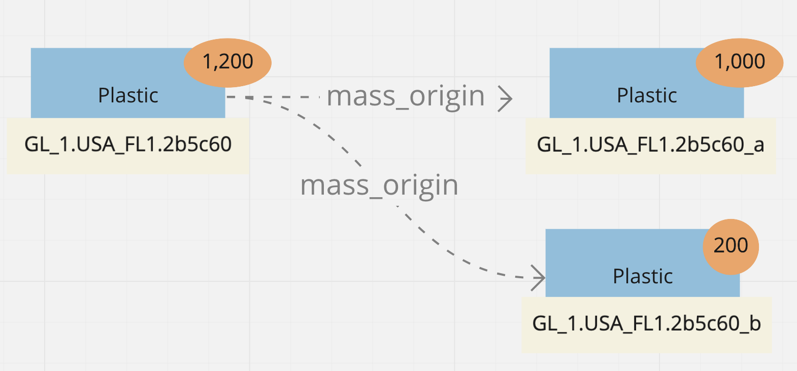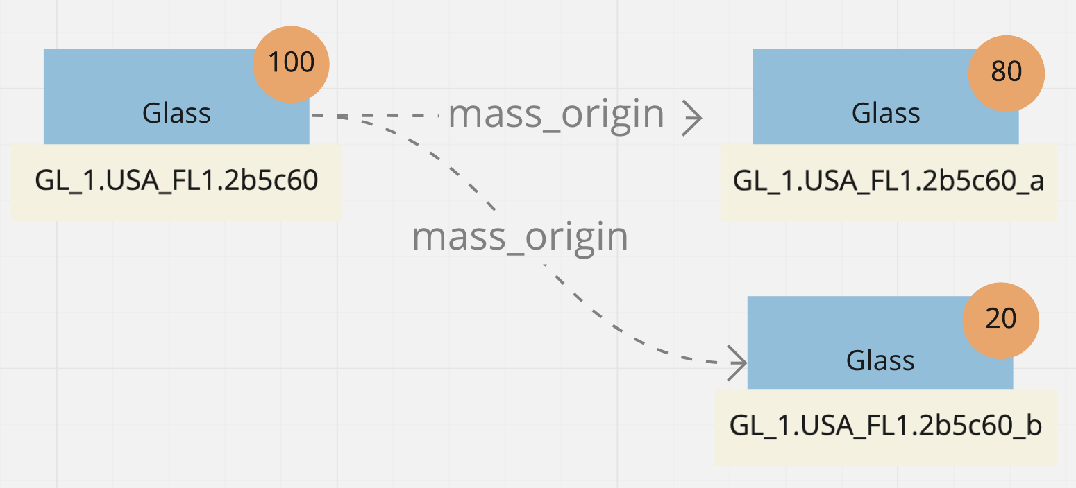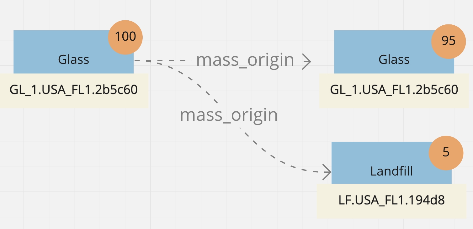 Let’s take a look at an example where a glass MassID weighing 100kg arrives at a glass bottling plant. Upon arrival the Validator at the Processor identifies that 5 kg of non-recyclable waste is mixed with the cullet, and once removed from the cullet heap it will need to be sent to a landfill. The original MassID will have its weight reduced by 5 kgs and a new Landfill MassID of 5 kgs will be created.