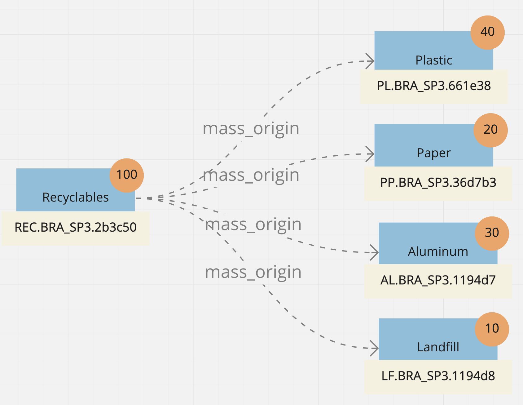 MassIDs can also originate in an aggregated waste unit, before getting broken down by material mass type. The most common example is when a MassID is born from a pick-up of commingled recycling, in other words: Plastic, Paper, Aluminum, etc. Let’s take a look at an example of commingled recycling pick-up in Brazil’s São Paulo state in the Municipality identified as number 3. The aggregated waste unit ceases to exist as it gets sorted into different material mass types, each with its own weight. However, the chain of custody is preserved on the blockchain.