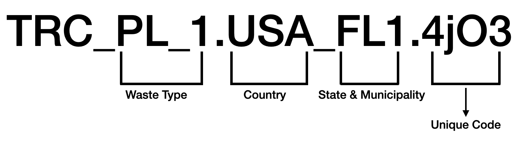 TRC notation involves identifying the name of the token type, the Waste Type, Location and Unique code. Note that TRCs cannot be split as they already constitute exactly 1 ton units of certified-recycled waste.