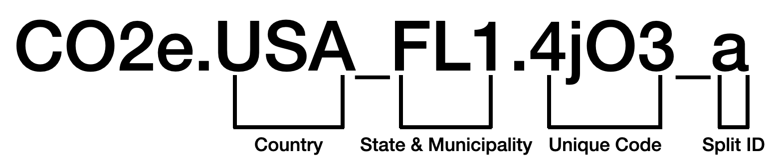 GasIDs are codified in a similar manner to MassIDs. The notation includes the “type” of pollution that was avoided, in this case CO2e, and the reference location inherited from its parent TRC. GasIDs contain a unique identifier and a split ID code, if the original GasID suffered a split. (For more on splits see MassID Splits.)