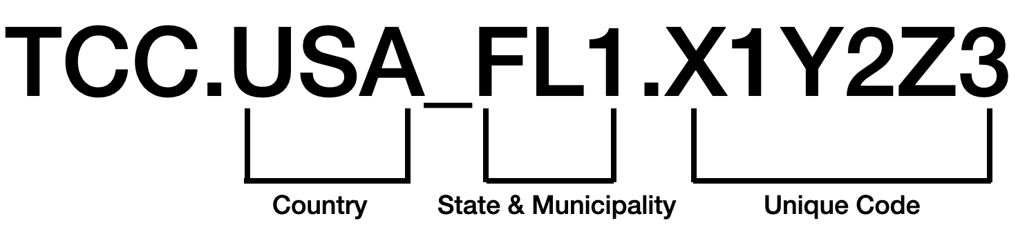 A TCC is noted in similar fashion to MassIDs and TRCs, using a location based identifier and a unique code to distinguish each token. Therefore, while the CO2e value of each TCC is the same in terms of weight (i.e. fungible) each one can be traced back to its original TRC and underlying MassIDs from the GasIDs that make up each TCC.